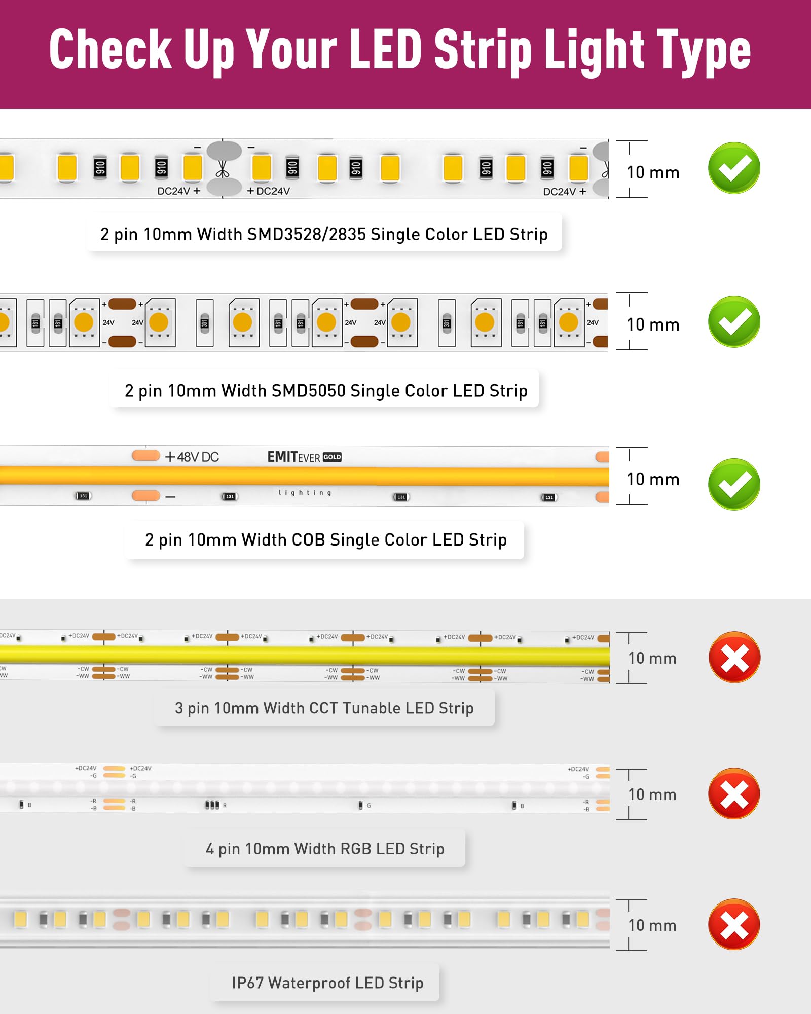 Before purchasing, ensure your LED strip light matches the specifications for the connectors: