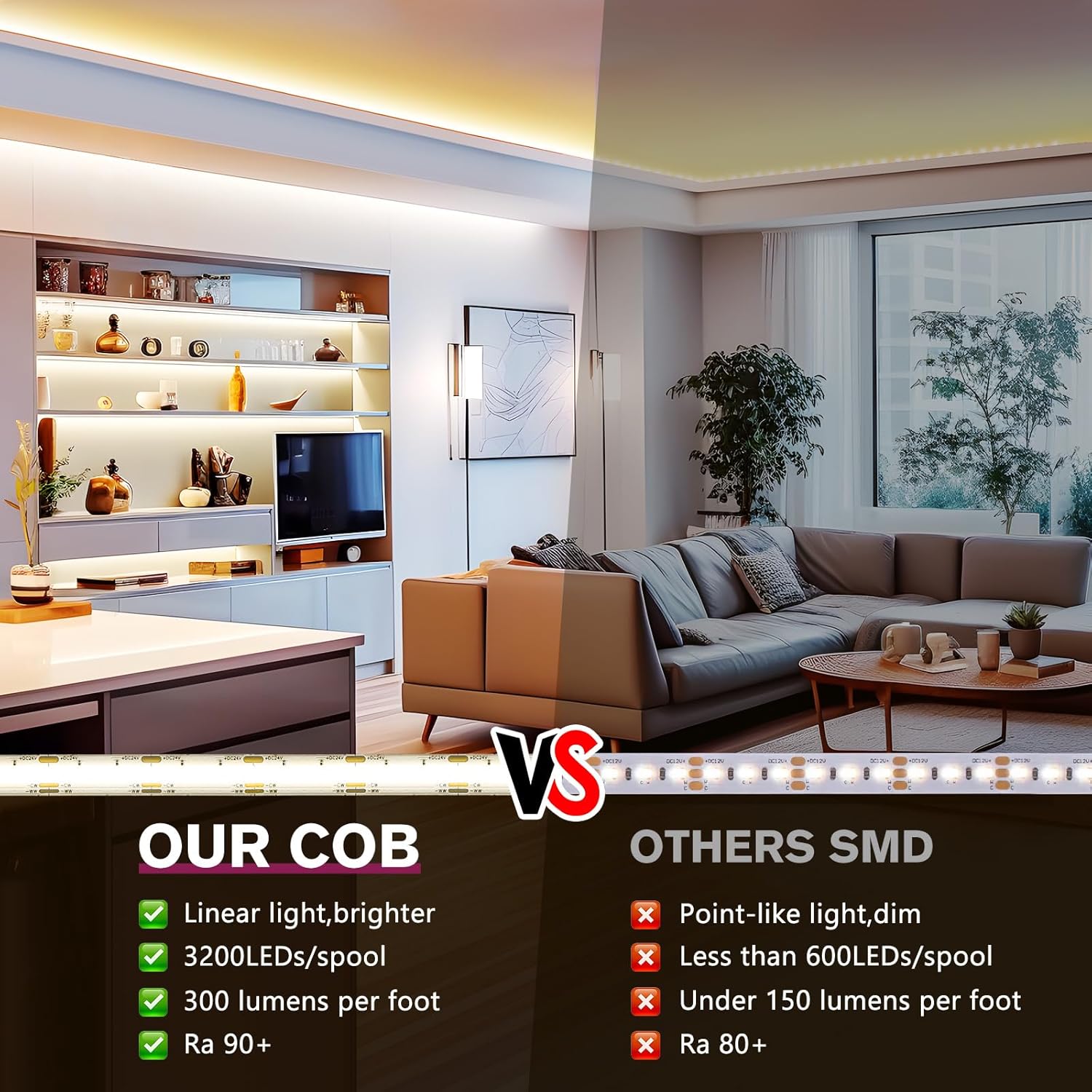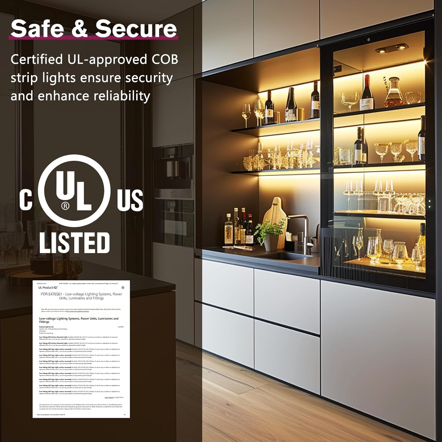 Thanks to Chip-on-Board (COB) technology, this strip light offers a seamless, dot-free light that’s uniform and bright, with an impressive CRI of 90+ for true color representation. Crafted to meet rigorous UL safety and quality standards, this strip light promises reliable, long-lasting performance.
