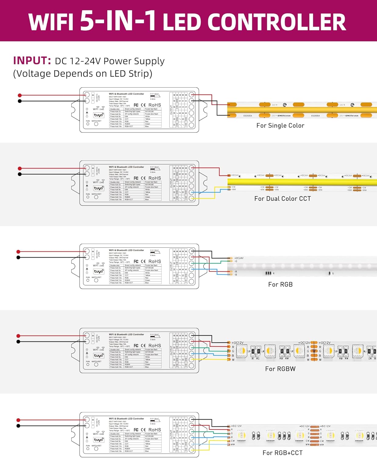 Bear in mind that this EMITEVER WiFi Bluetooth 5-in-1 LED Controller is not a power supply/transformer. This controller installs AFTER your transformer, and effectively adds remote control and smart home functionality to your existing LED lighting system. This controller works with a wide variety of LED light types, allowing you to use your smart phone (with Tuya of SmartLife app installed), including your Alexa or Google Home devices, to control your light. It's pretty ingenious! Being that I have limited knowledge of lighting systems, it took me a little bit to figure it all out. Once I did, however, installation was pretty simply. The controller easily connected with the SmartLife App that I have installed on my phone. While the smart phone app provides you with a wide variety of controls, I find that mostly use my Alexa devices to control this LED strip lighting. It works great and makes life just a little more convenient. I think it's very reasonably priced for the convenience it provides. I like it! Recommend.