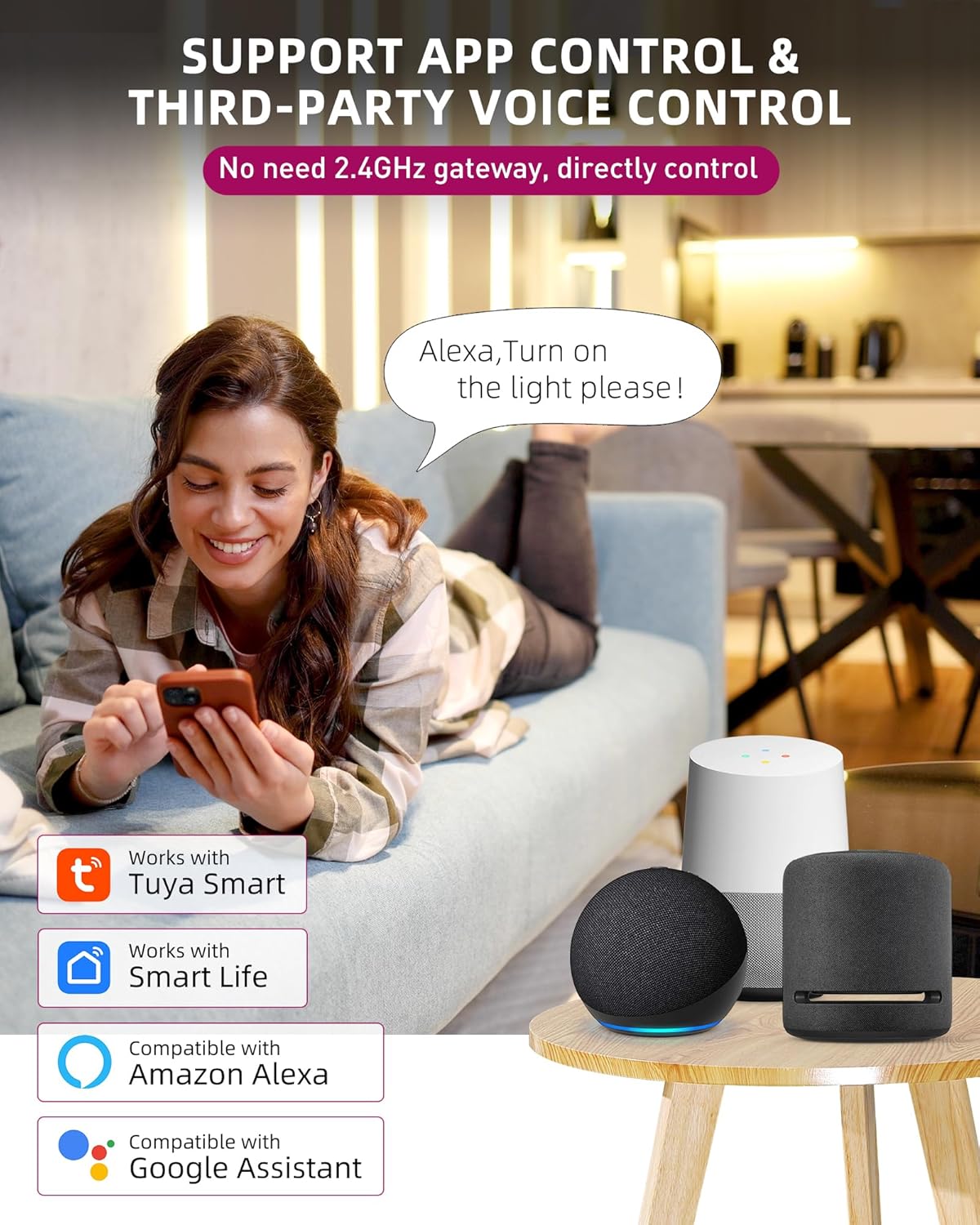 Voice control compatibility with Amazon Alexa and Google Home.